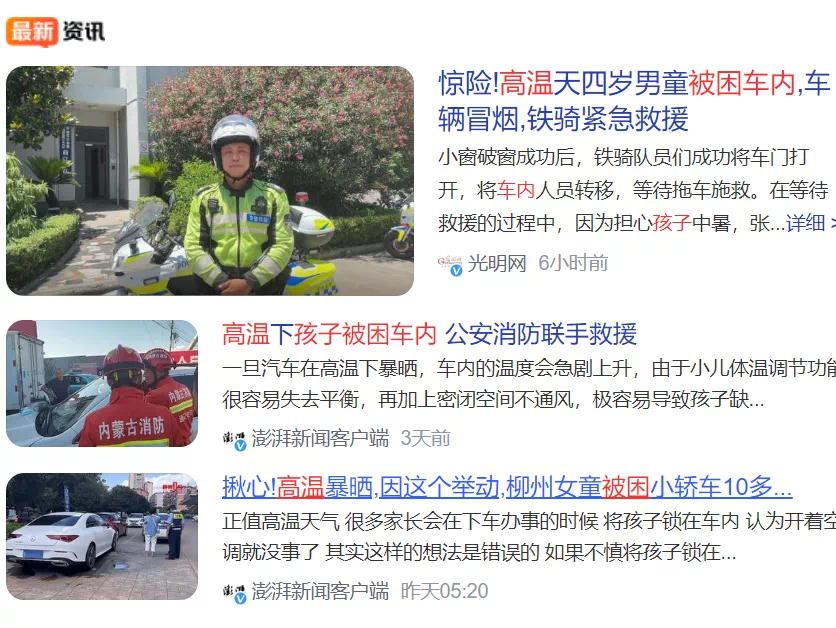 有研究显示,阳光照射下车辆仅仅停留 1小时,座椅温度就达到了 60 度以上,而人体只要体温高于 40 度就有中暑风险,更不要说孩子的体温上升速度远超于成年人。