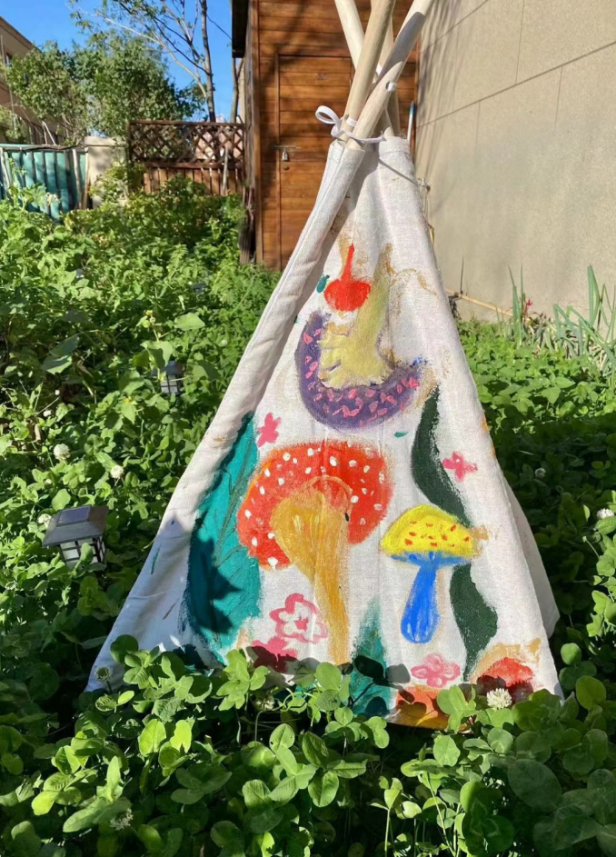 户外课堂正式开讲!老师们耐心细致的讲解了DIY帐篷的构思方法及绘制技巧,并用绘本故事爱丽丝梦游仙境进行了启发,带孩子找蘑菇,捡叶子,让真实的触感带动视觉灵动……在大自然面前,世间万物都有它的美妙,孩子们兴奋的当起了侦探家,七嘴八舌的交流着自己的新发现。