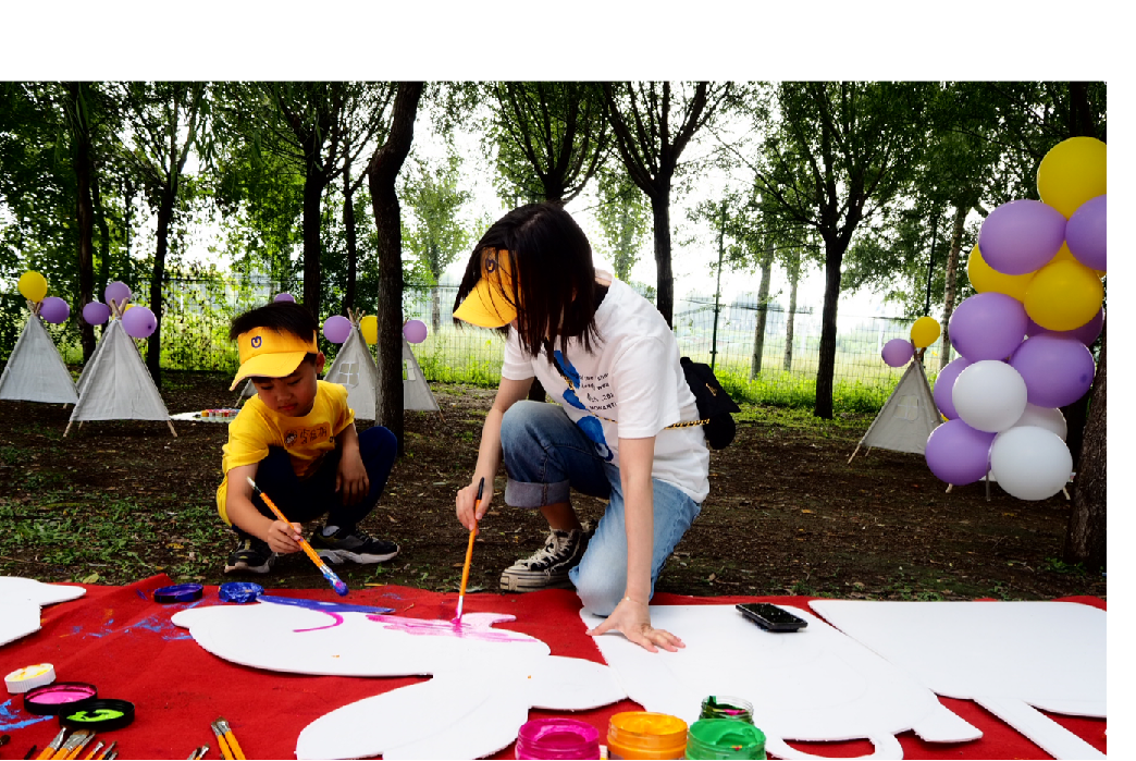 周末一大早,老师们早早集合,带着写生物料,为活动布置场地。原本平淡无奇的绿地被装点成了户外大PARTY。临近10点,报名的30组家庭陆续赶到现场,孩子们顿时被美妙的氛围感染了,兴奋的脸上开满了花。亲子活动开始,爸爸妈妈跟孩子一起参与到涂鸦装置艺术中,新奇和兴奋的心情溢于言表,和孩子一起,进行帐篷搭建绘制。