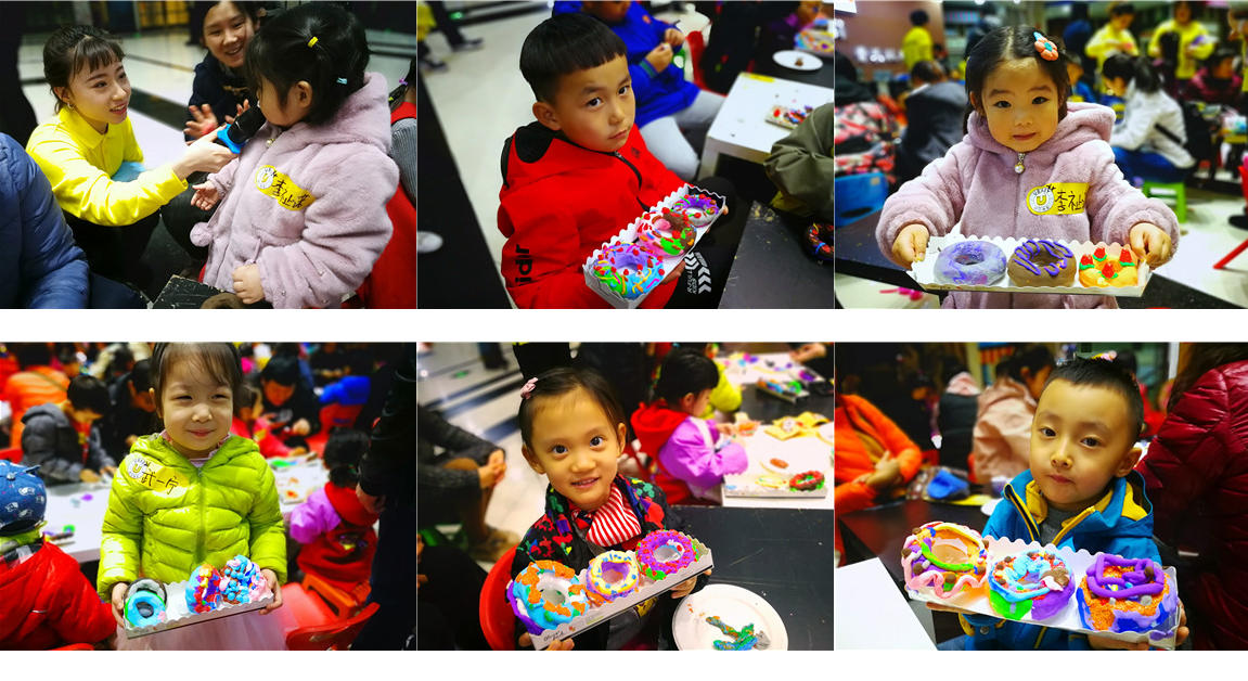 用时下有趣的歌曲勾起孩子的兴趣,手工制作黏土甜甜圈,促进亲子互动,与家长增进沟通。