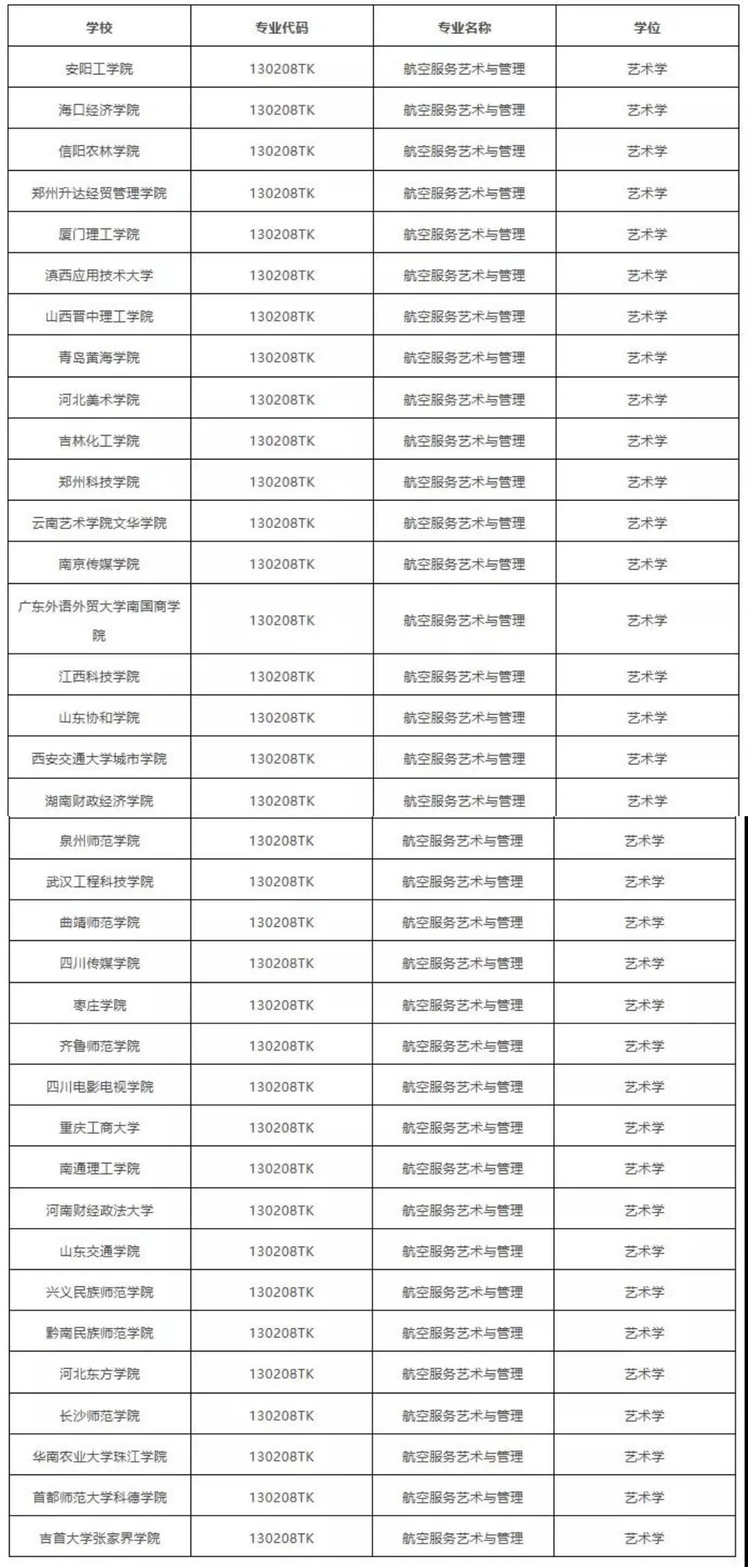 在新增艺术类专业的65所大学中,航空服务艺术管理专业就占了36所,由此可见空乘专业目前的热度算是非常之高,具体院校名单如下: