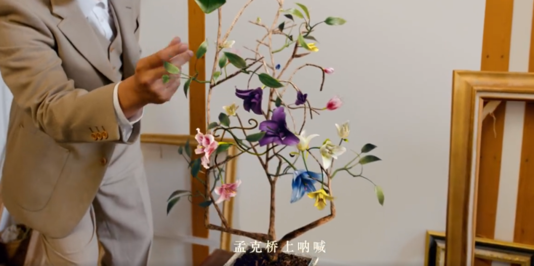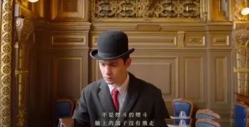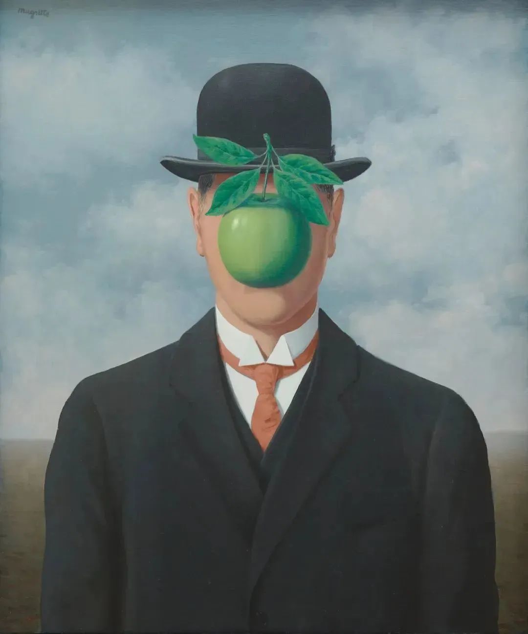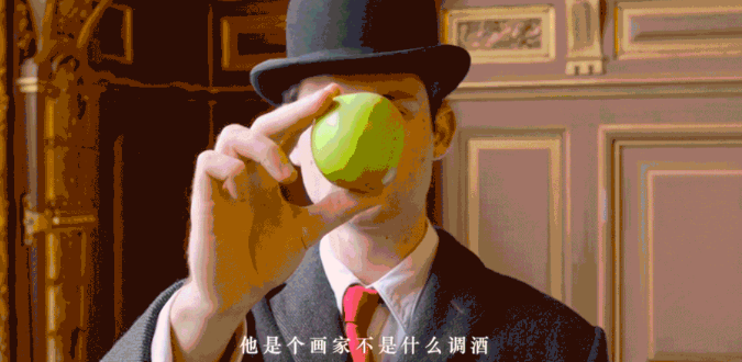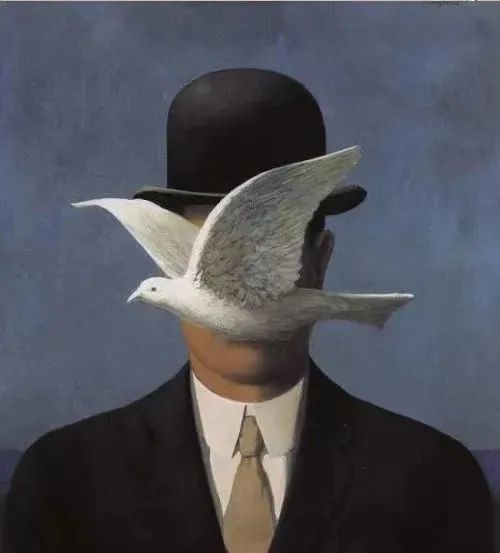 “脸上的鸽子没有飞走”指的是马格利特在《人类之子》同年绘制的《戴圆顶礼帽的男人》。