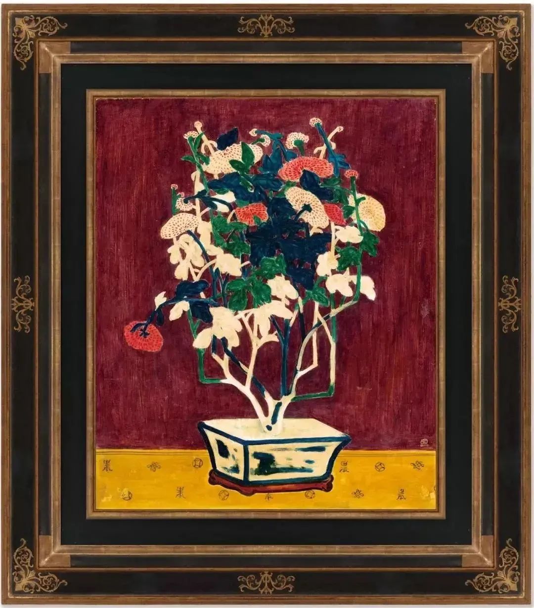 常玉先生的另一幅作品《聚瑞盈香》也拍出了7700W的高价,这件以万寿菊为主题的《聚瑞盈香》无论从元素、构图,或是色彩、笔法,均将晚期鲜明的艺术风格体现得淋漓尽致。