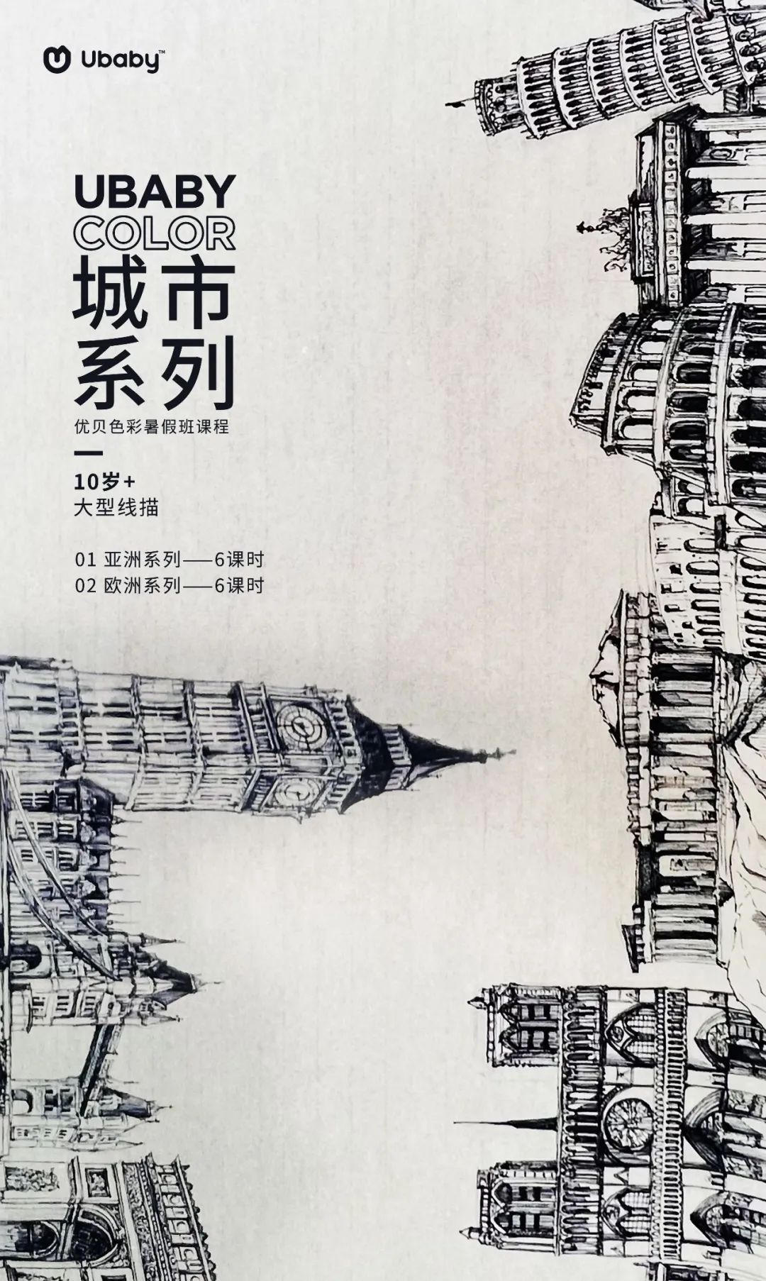 这个假期我们还要完成两幅大型线描作品——亚洲系列和欧洲系列。这个课程极其锻炼和考验孩子的绘画功底,用密密的线条,来描绘建筑和景观。这样的一幅作品呈现,一定会让孩子快速成长,同时收获自信和快乐!